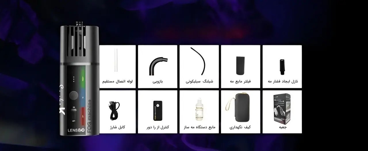 - منبع مایع: معمولاً از مایعات مه پایه آب یا مایع مخصوص LENSGO استفاده میشود